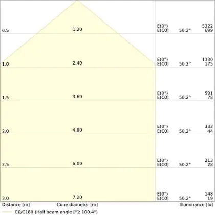 Der Abstrahlwinkel bezeichnet den Winkel, in dem das Licht aus der Lichtquelle ausgestrahlt wird. Er wird in Grad (D) angegeben. Je geringer die Gradzahl des Abstrahlwinkels ist, desto kleiner ist auch der Durchmesser des Lichtkegels, den die Lichtquelle produziert. Beispiel: Wird eine Lampe mit einem Abstrahlwinkel von 60 Grad an der Decke (2,5 m Höhe) angebracht, erzeugt sie einen Lichtkegel von 2,9 Metern Durchmesser. Hat die Lampe hingegen einen Abstrahlwinkel von 120 Grad, beträgt der Lichtkegel 8,7 Meter im Durchmesser. |
