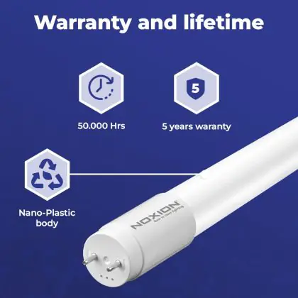 Die T8 LED-Röhre von Noxion kann nicht nur mit einer langen Lebensdauer von 50000 Stunden, sondern auch mit einer hohen Lumeneffizienz von lm/W überzeugen. Sie strahlt ihr Licht in der Farbtemperatur 6500K - Tageslichtweiß aus und wird mit betrieben. Im Preis ist zudem eine All-In-Garantie von 5 Jahre Jahren enthalten.