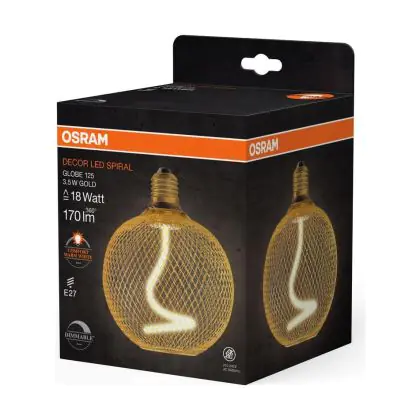 Die Osram Decor Spiral E27 Globe Fadenlampe Gold 3.5W 170lm - 818 Extra Warmweiß | Dimmbar - Ersatz Für 15W ist eine effiziente E27 LED-Lampe mit Retrodesign und der perfekte Ersatz für Ihre konventionellen 15W Lampen mit E27. Zudem strahlt sie Licht in der Farbtemperatur 1800K - Extra Warmweiß aus und punktet durch eine lange Lebensdauer.