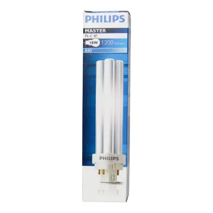 Philips PL-C 4P sind Kompakt-Leuchtstofflampen mit separaten Stromversorgungen, ohne Anlasser oder Kondensator. Dieses Modell ist sehr energieeffizient und ist mit einer 4-Pin-Buchse ausgestattet. Philips PL-C 18W 840 4P (MASTER) sind mit einem G24q-2 Sockel-Typ ausgestattet und messen 143mm.